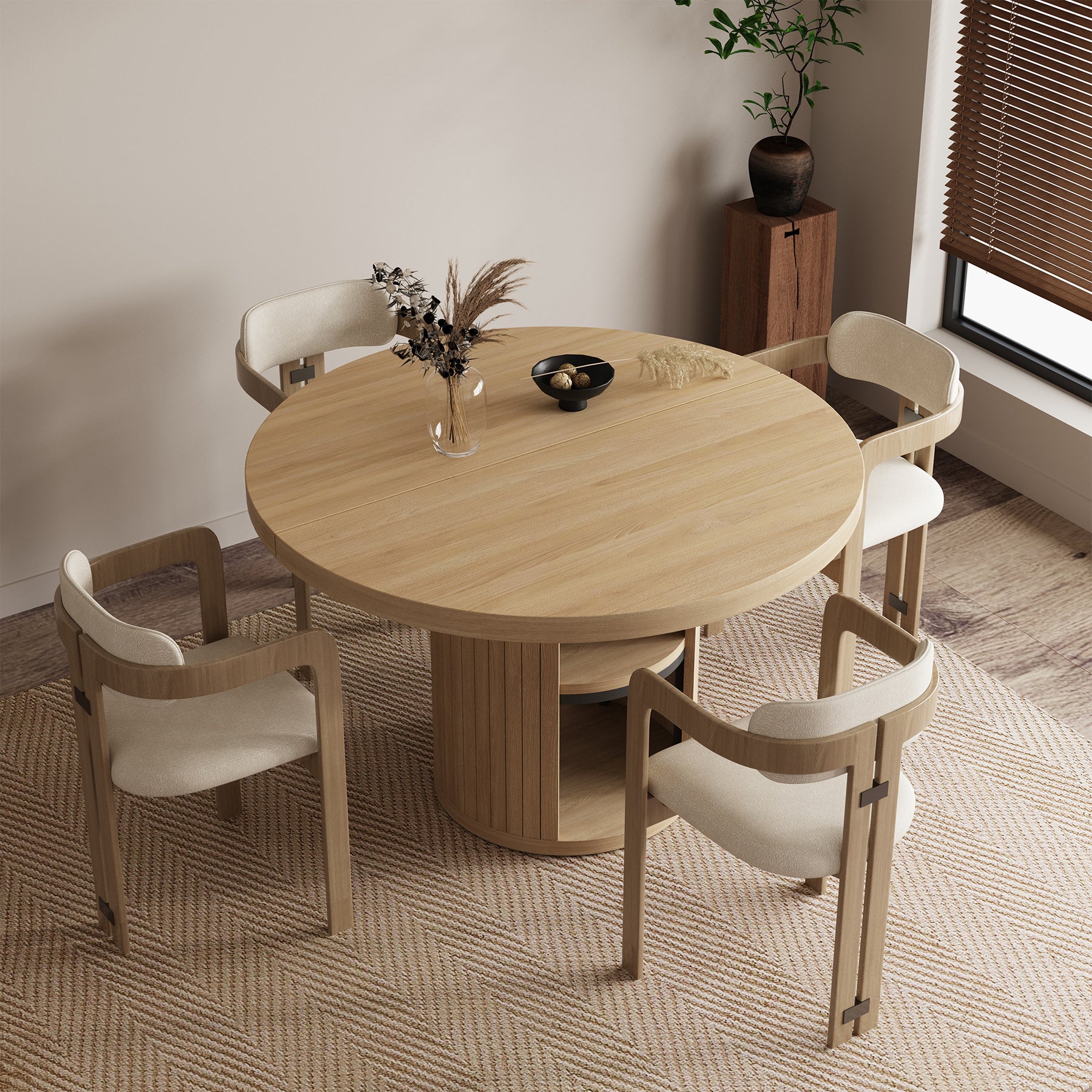 47-Inch Round Wood Dining Table with Open Storage Shelves for Dining Room, 4-6 People Farmhouse Circle Kitchen Dinner Tables with Fluted Design for Living Room, Apartments, Light Oak Brown