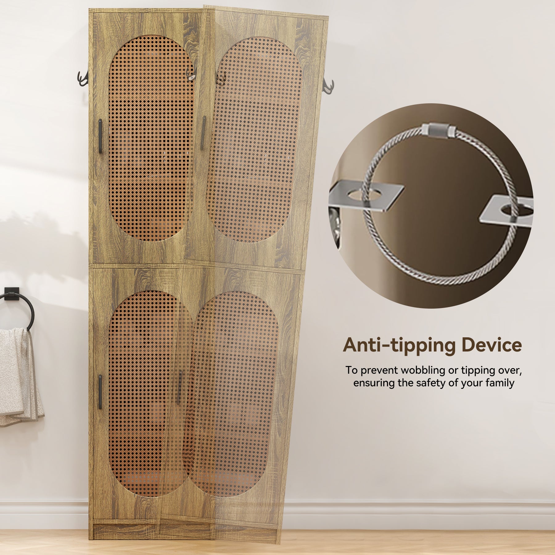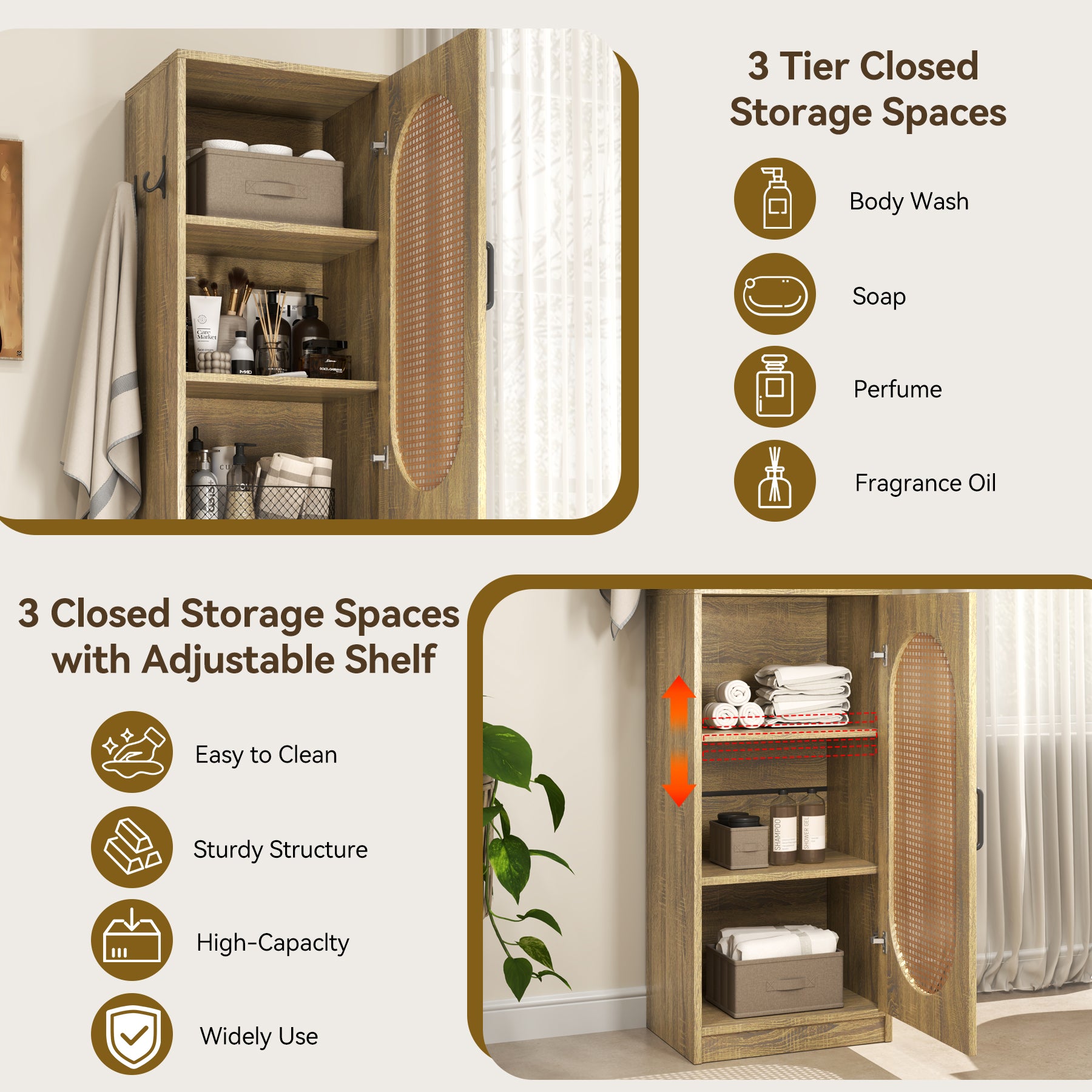 66-Inch Bathroom Storage Cabinet with 2 Rattan Doors for Toilet, Tall Narrow Bath Room Cabinets, Slim Wooden Floor Storage Cabinets with Adjustable Shelves and 4 Hooks for Restroom, Brown