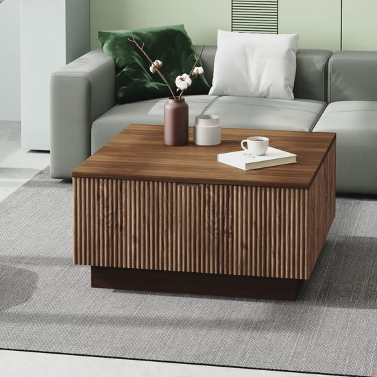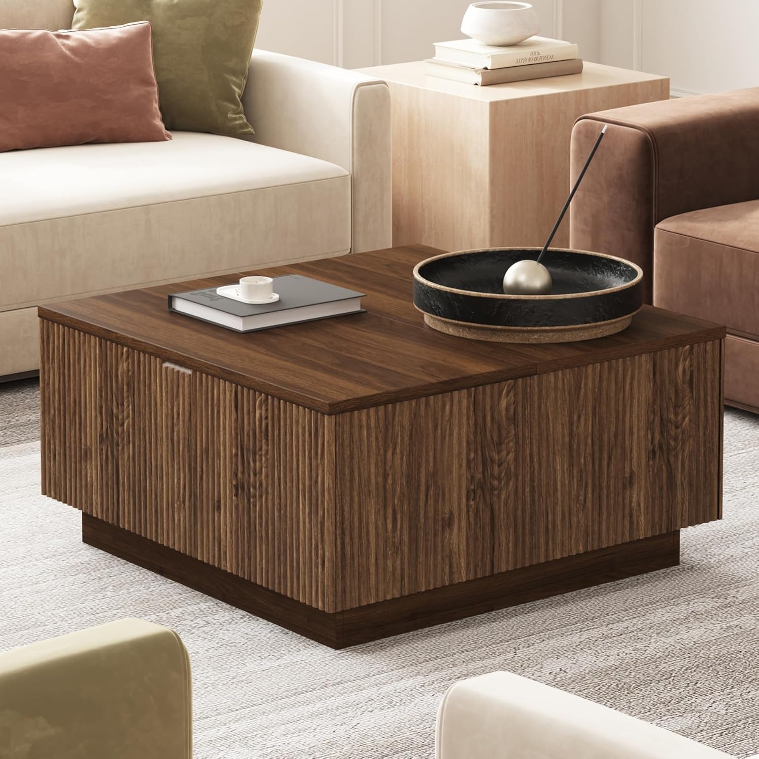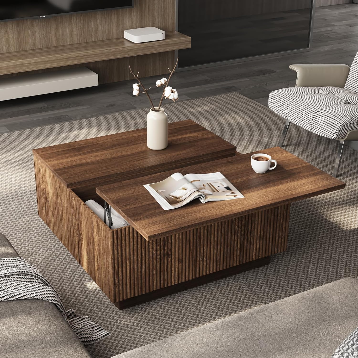 Lift Top Square Wood Coffee Table with Hidden Storage Compartment for Living Room, 31-Inch Farmhouse Fluted Center Tea Table with Wooden Lift-Top for Home, Apartment, Small Space, Brown Walnut